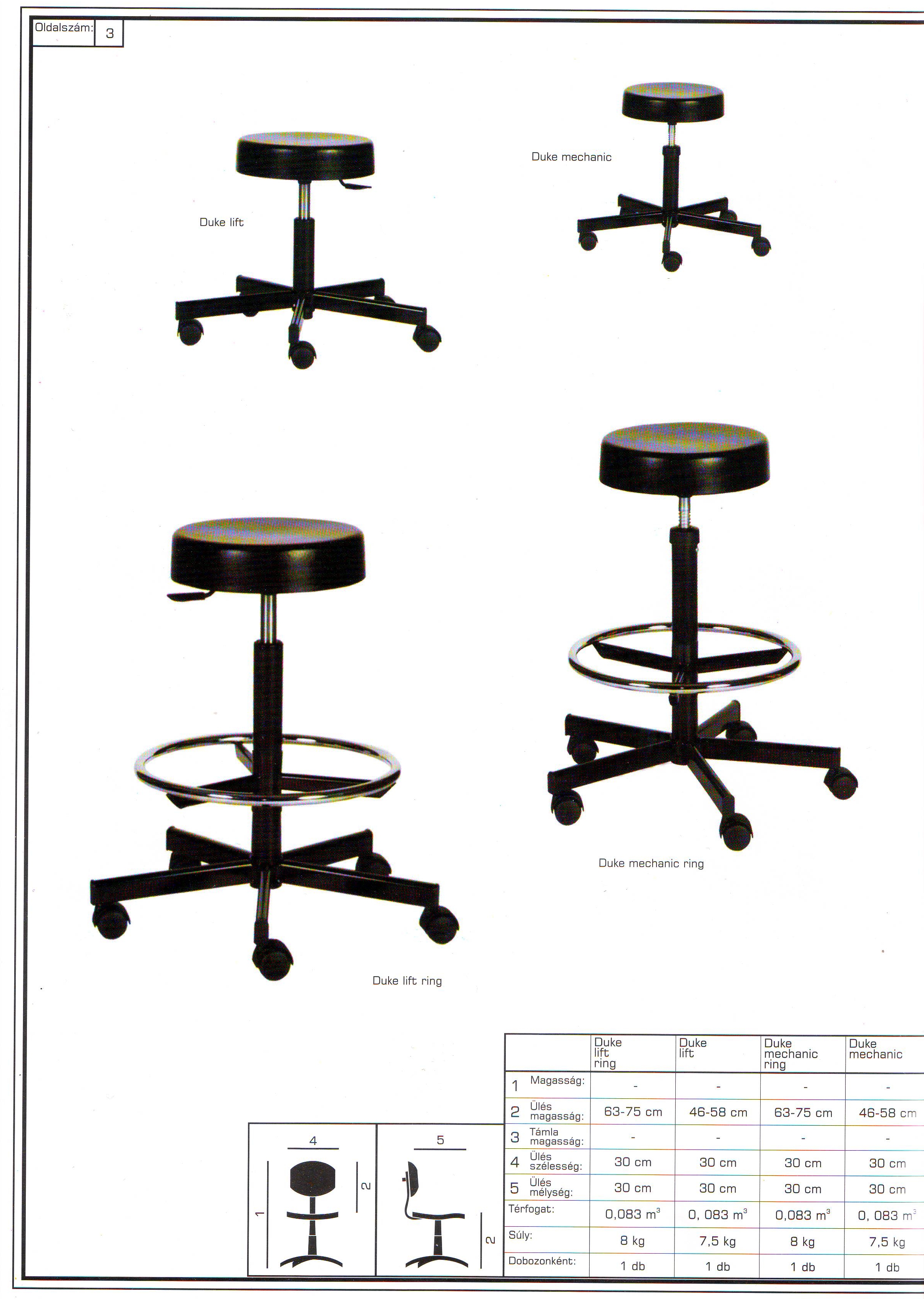 Ipari forgószék, fekete poliuretán ülőfelülettel, gázlifttel, 5-ágú lábcsillaggal és görgőkkel, "Ring" lábkarikával. Ülésmagasság: 50-54 cm; ülőlap átmérője: 32cm.