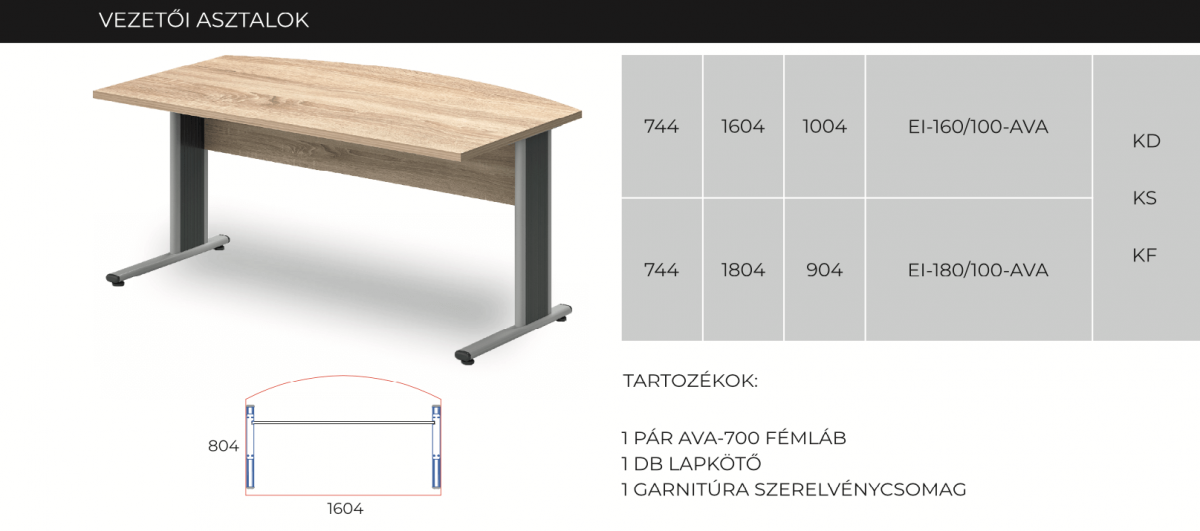 Vénusz vezetői asztal AVA fém lábszerkezettel, elegáns íves kialakítással. Mérete: 160*100*74 cm Az asztalok formai és méretbeli kialakítása maximálisan igazodik mind az egyéni ízléshez, mind pedig a funkcionális igényekhez.
