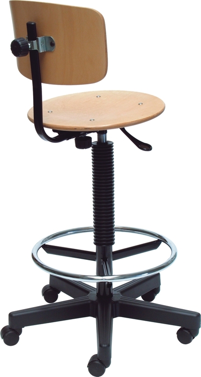 Ipari forgószék, fa ülő- és hátfelülettel, gázlifttel, háttámla magasság- és távolságállítást lehetővé tevő mechanikával, 5-ágú lábcsillaggal és görgőkkel, "Ring" lábkarikával. Ülésmagasság: 56-70cm; teljesmagasság: 92-104cm; ülésszélesség: 40cm; ülésmélység: 40cm.